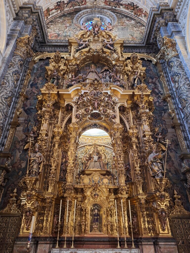 El retablo mayor es la obra maestra de Cayetano de Acosta, creado en el siglo XVIII. A lo largo de sus cuerpos vemos el Sagrario, la Inmaculada Concepción, la Tansfiguración de Cristo y la figura de Dios que señala a Jesús. Se culmina con una bóveda decorada con una pintura mural de Juan Espinal que representa la gloria celestial ante el espíritu santo que estaca en el centro.